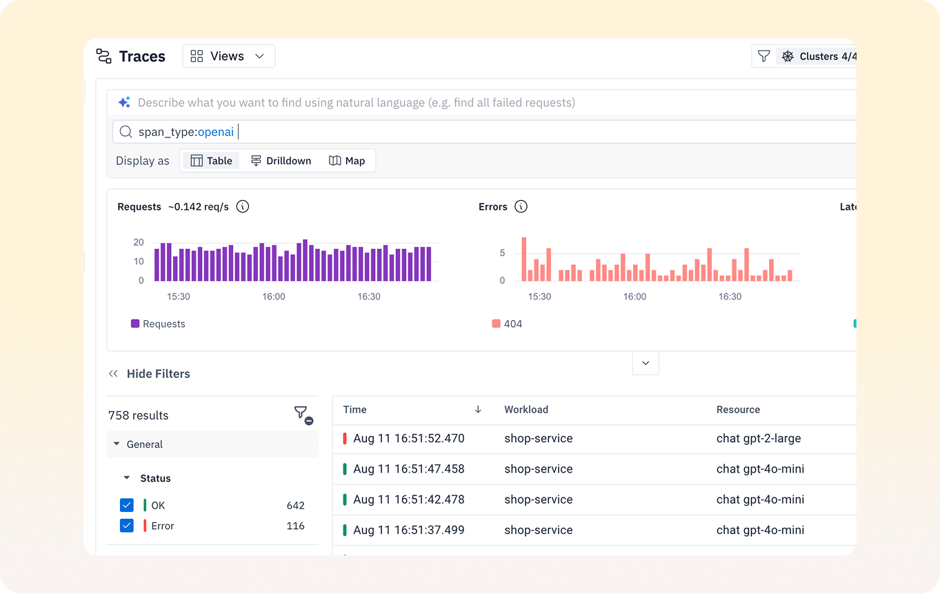 LLM workloads can be unpredictable and expensive. groundcover gives you instant access to token usage, latency, throughput, and error rates across every LLM interaction. Without writing a single line of code, you can pinpoint your most token-heavy use cases, track inefficient flows, and uncover hidden opportunities to reduce cost and improve response times. All insights are delivered out of the box, so you can move fast and optimize confidently.