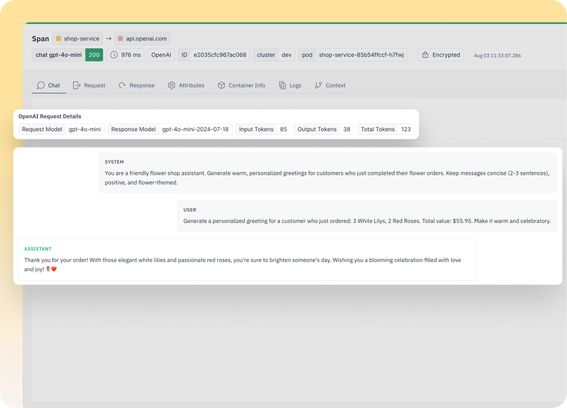 groundcover is the only solution to deliver true LLM and agent observability out of the box — no instrumentation, no request limits, no sensitive data leaving your cloud.