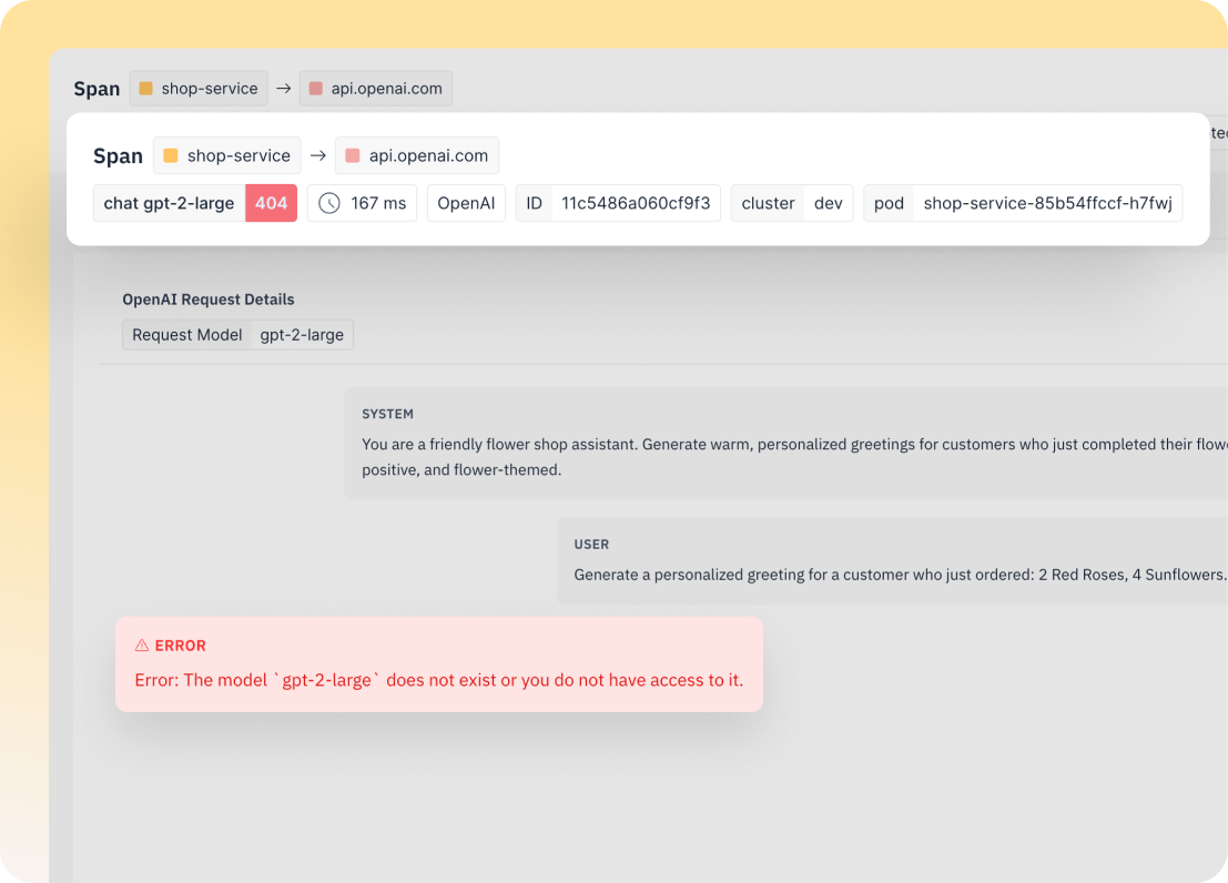 LLM responses rarely fail in isolation. groundcover captures the complete execution context behind every request including prompts, response payloads, tool usage, and session history so you can trace quality issues back to their source. Whether you're debugging hallucinations, drift, or inconsistent output, you’ll see not just what went wrong, but how and why it happened. This context is key to maintaining output quality in real-world, production environments.