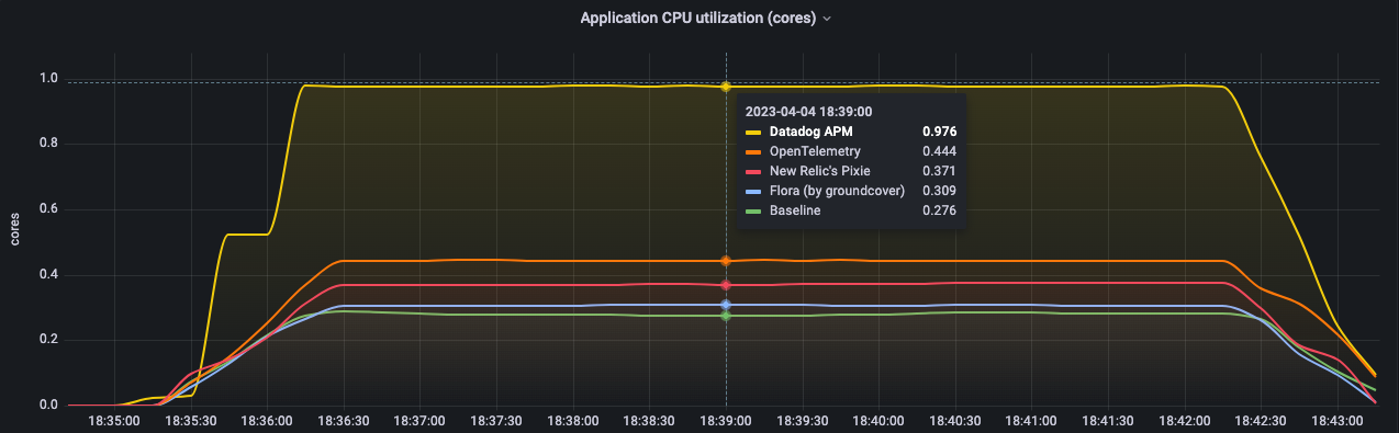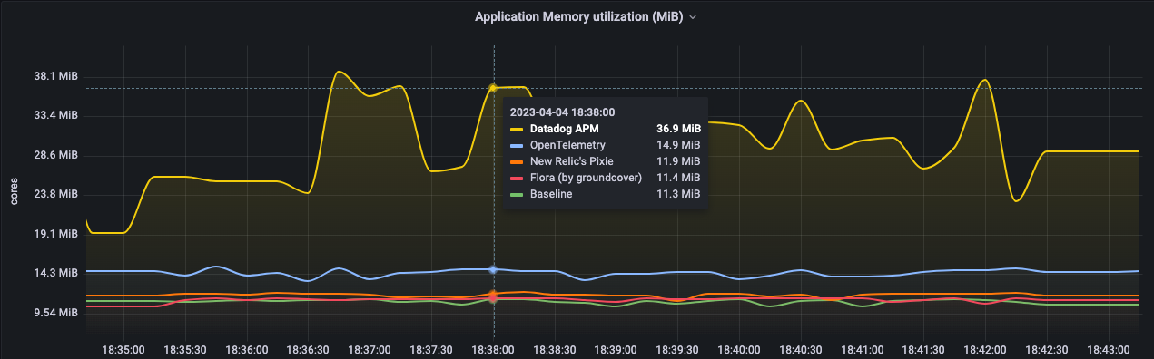 The test application was then tested in the different scenarios as is (for baseline), when instrumented according to relevant documentation of Datadog and OpenTelemetry, and when running on a Kubernetes node alongside New Relic’s Pixie agent and the Flora agent. Prometheus-based CPU and memory utilization metrics were generated for all test cases, and were scraped and stored in a VictoriaMetrics database instance.