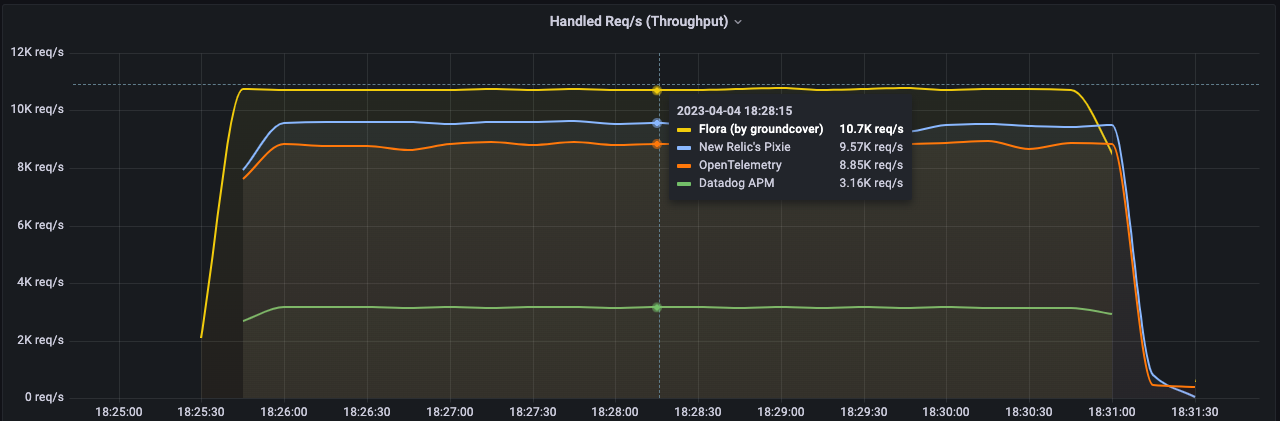 All theory aside, we rolled up our sleeves and started looking into what kind of value Flora can truly provide our users. Flora dramatically outperformed all leading observability platforms including Datadog, OpenTelemetry and New Relic’s modern eBPF solution - Pixie Labs.