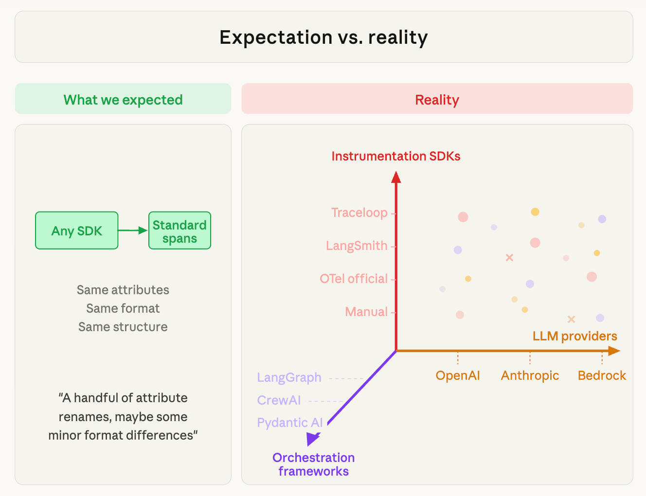 The same provider, instrumented by the same SDK, produces different telemetry depending on the framework. - LLM providers — who is being called. OpenAI, Anthropic, Bedrock, Gemini, Groq, Mistral. Each provider has its own API format, its own token semantics (does "input tokens" include cache?), its own message structure (content blocks vs. content strings), its own tool call format, and its own finish reason vocabulary.