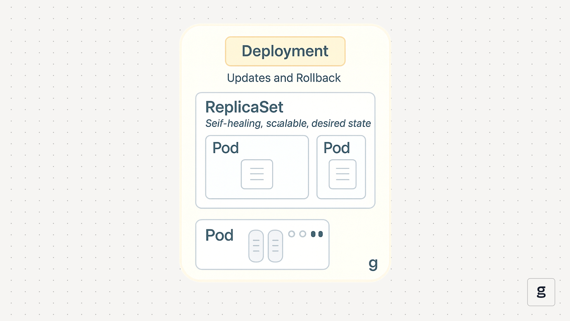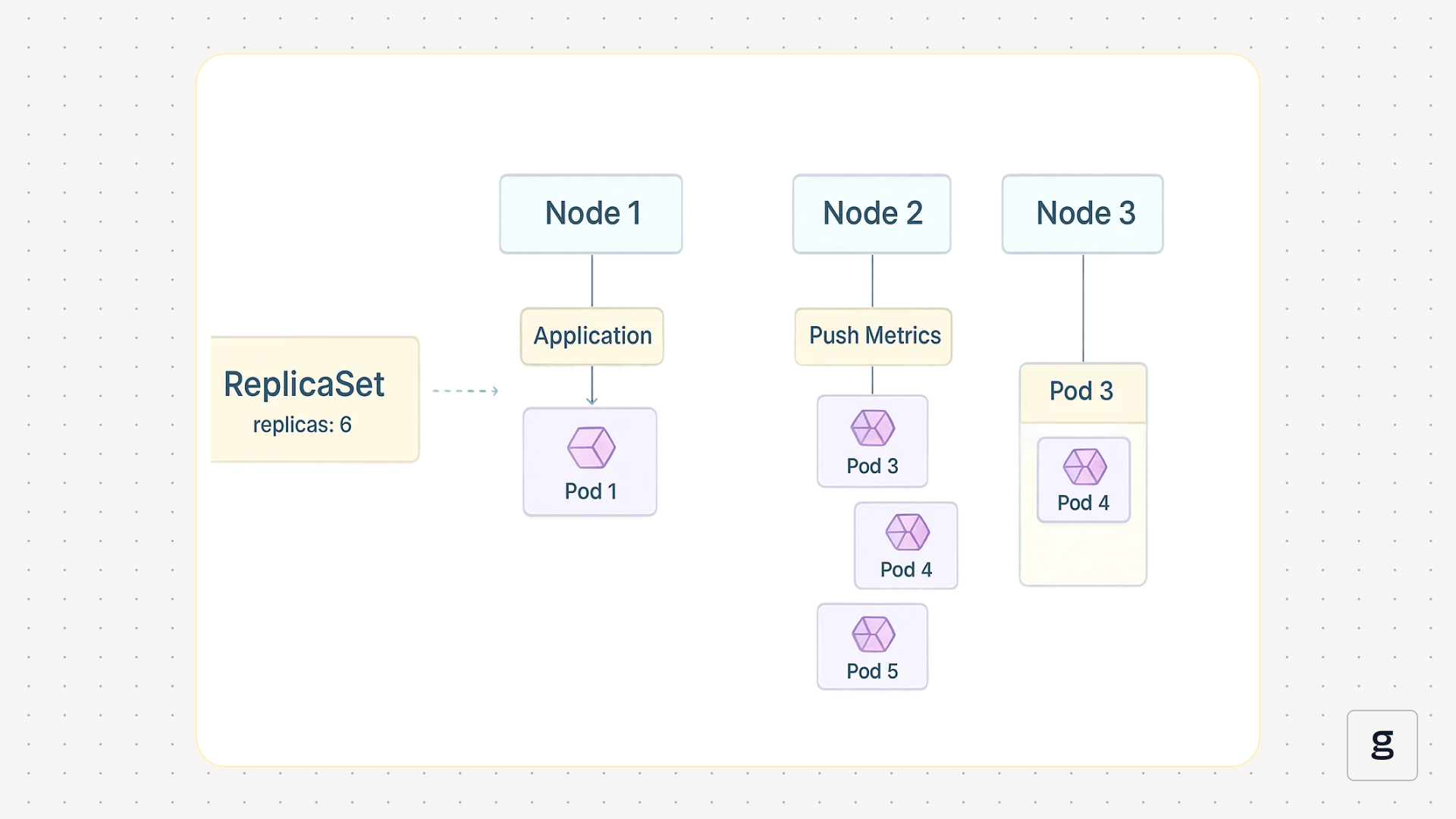 A ReplicaSet is a type of object that tells the Kubernetes deployment controller to maintain a specific number of copies of a Pod (for full details on how this works, check out our guide to ReplicaSets).