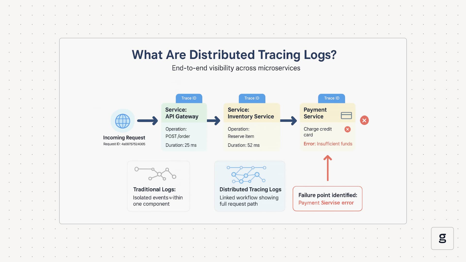 This connection is what differentiates distributed tracing logs from regular logs. Traditional logs only describe what happens inside one component. Distributed tracing logs reveal how each component contributes to the overall workflow. This makes it easier to locate delays, failures, or misconfigurations.