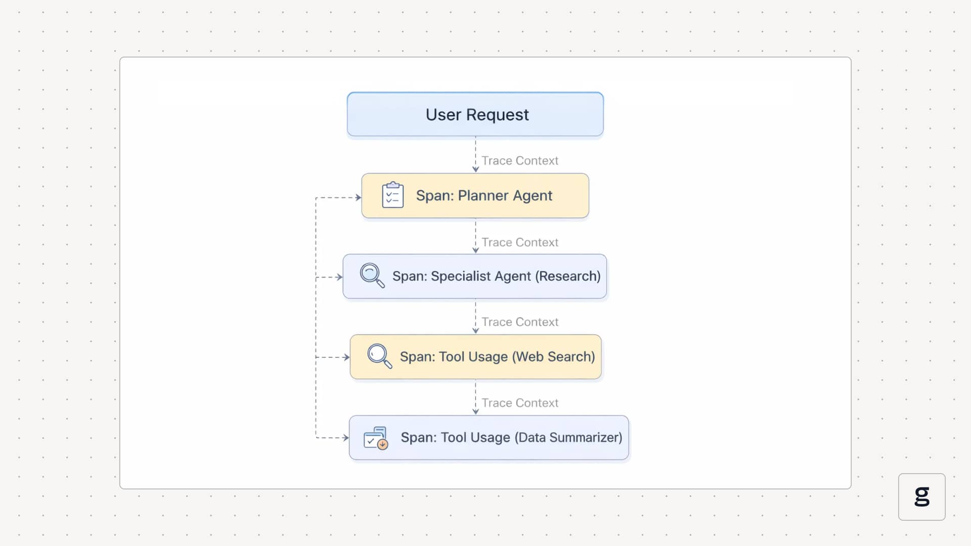 Many production setups are multi-agent by design. A planner agent delegates work to specialist agents, which call tools and services. Agent observability must show how a single user request moves through that entire chain, not just what one agent did.