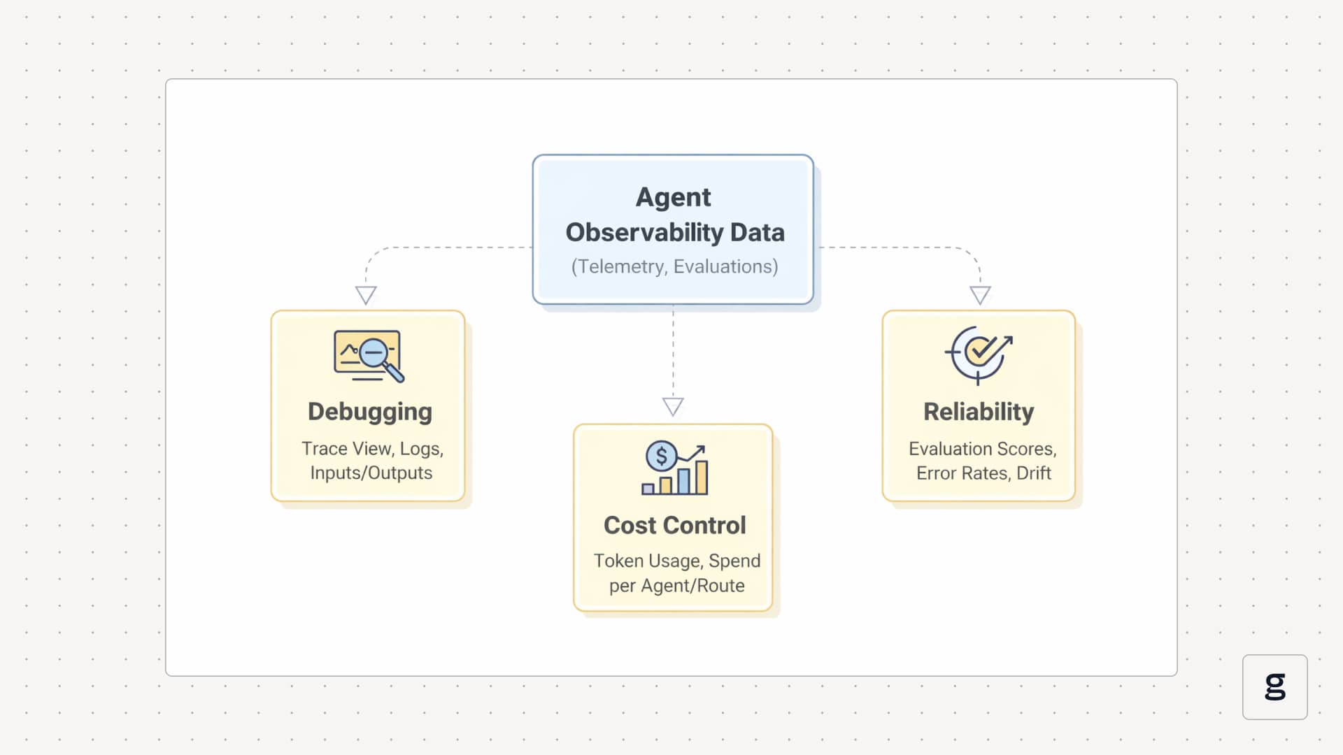 Once telemetry is flowing, the same agent observability data powers three main operational loops: debugging, cost control, and reliability.