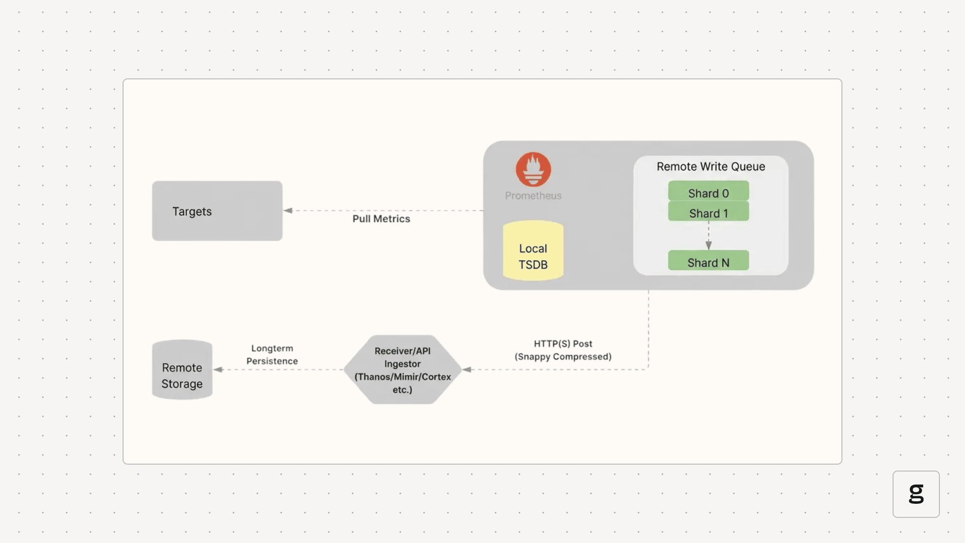 - Compression and POST: Once a batch is ready, Prometheus compresses it using Snappy and sends it to the remote endpoint via an HTTP POST request.
