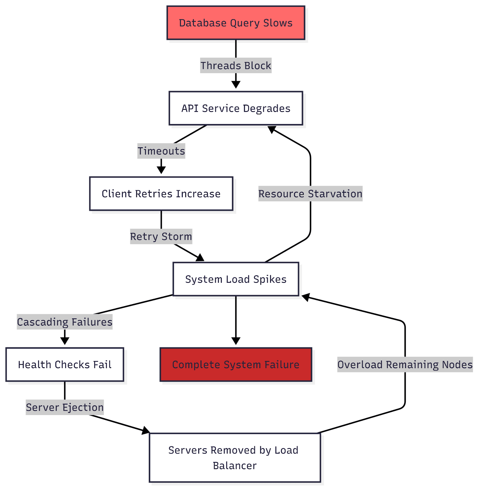 Research on cascading failure patterns shows that this feedback loop is present in most distributed systems with retry logic. Load balancers make this worse. When health checks fail, load balancers may remove or deprioritize servers from rotation, forcing fewer instances to handle the same traffic. The remaining servers get overloaded. The feedback loop accelerates until everything is gone.