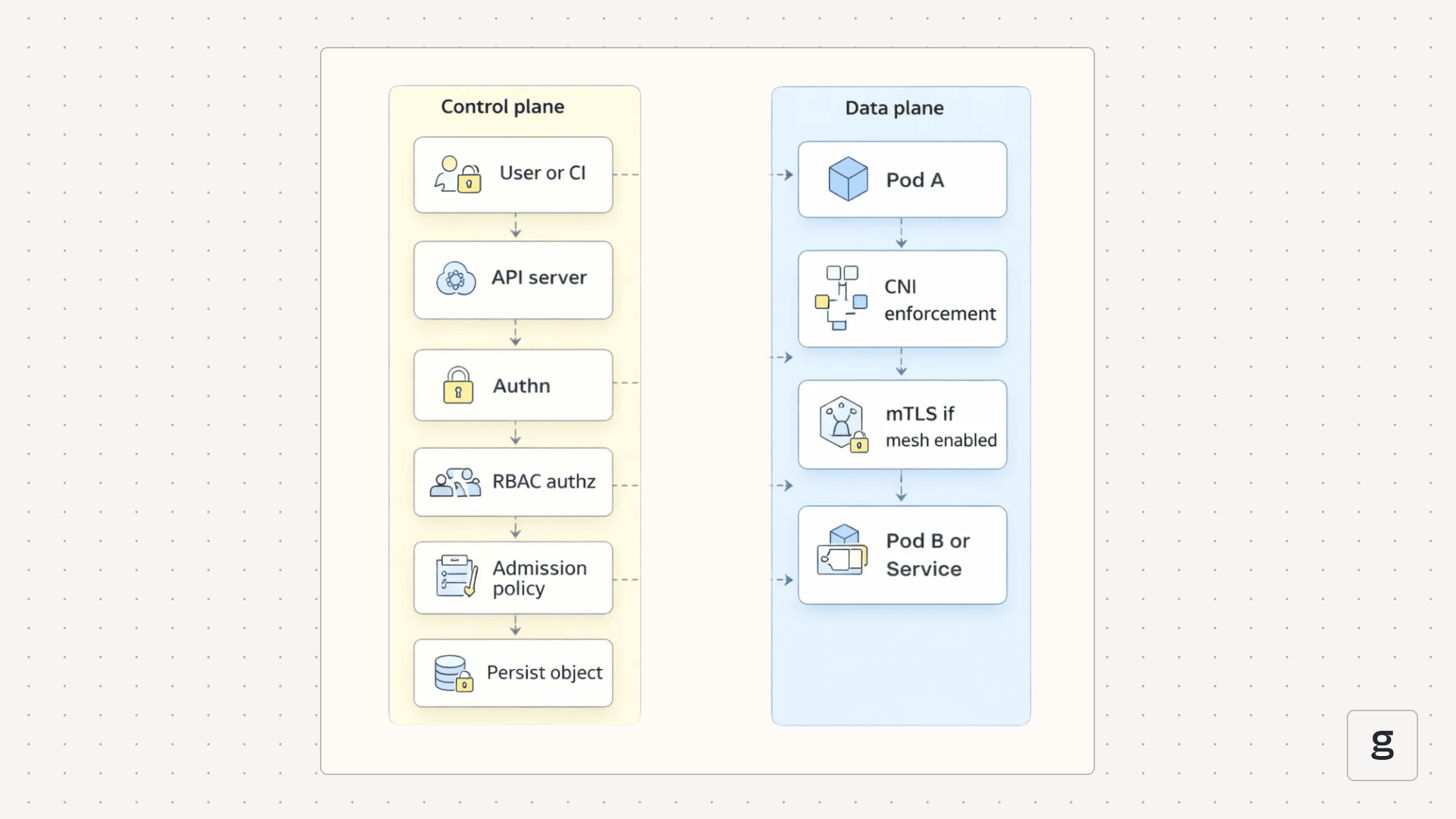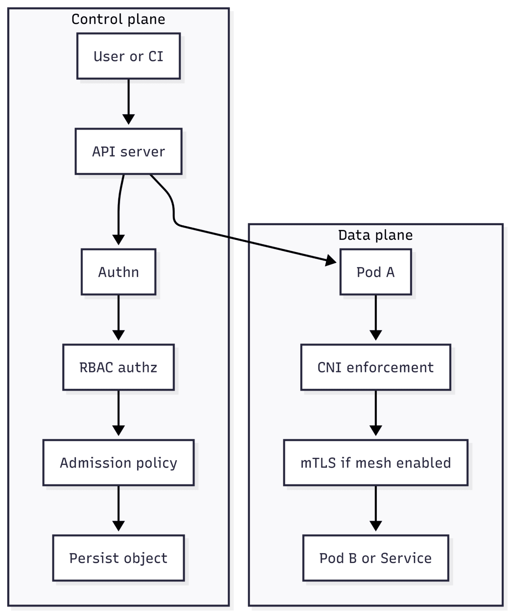 For Kubernetes API changes, the API server checks authentication and RBAC authorization, then runs admission controls before persisting the object. Runtime pod-to-pod traffic is enforced separately in the data plane, for example, by a CNI enforcing NetworkPolicies. RBAC answers “are you allowed,” and admission controls answer “is this compliant before it is stored.”