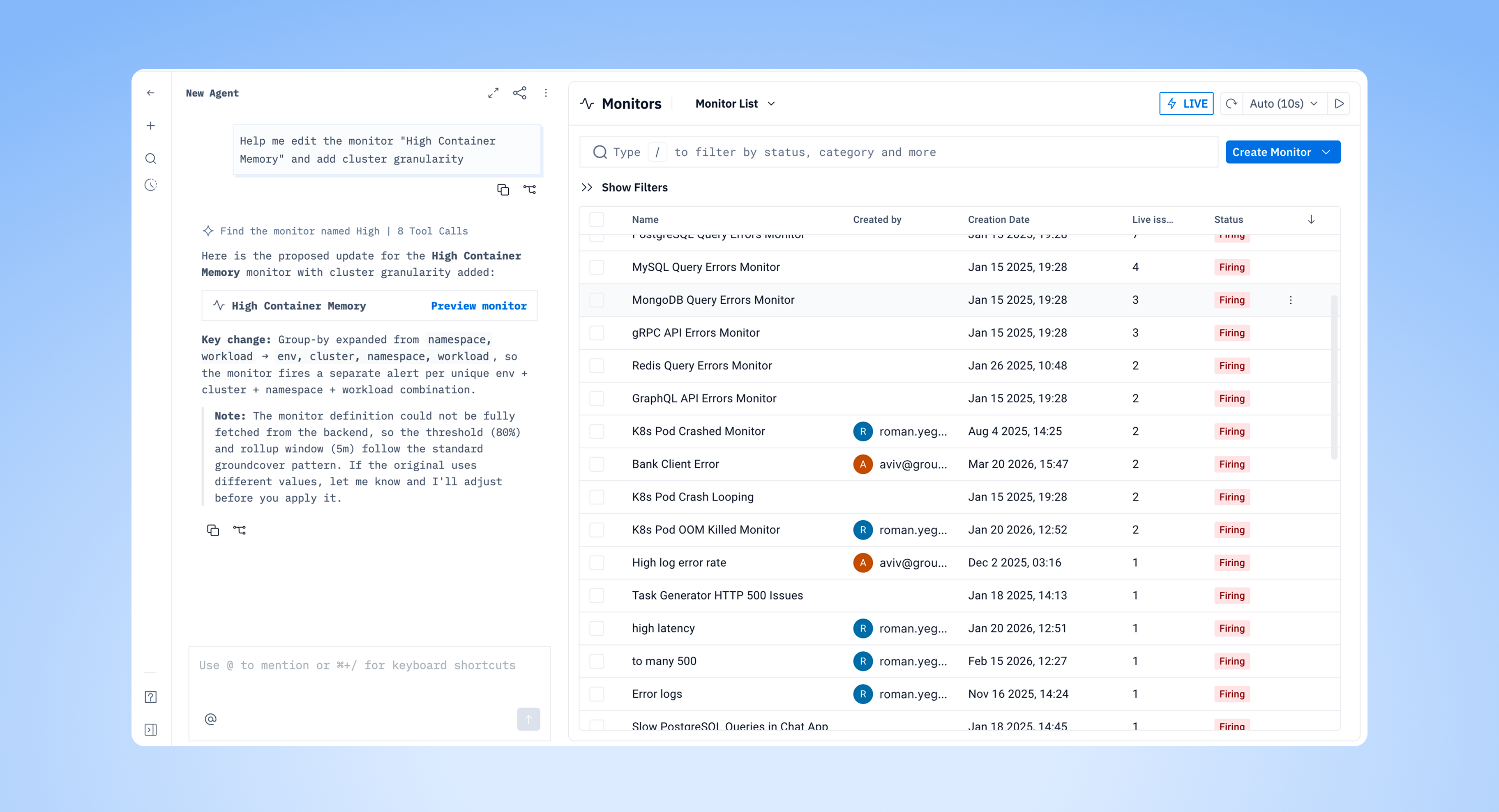 The Agent can now update your monitors directly. Change thresholds, edit descriptions, and modify notification routing - all from the chat interface without switching to the Monitor Wizard. Useful when you're investigating an issue and realize a monitor needs tuning. Tell the Agent what to change and it handles the update.